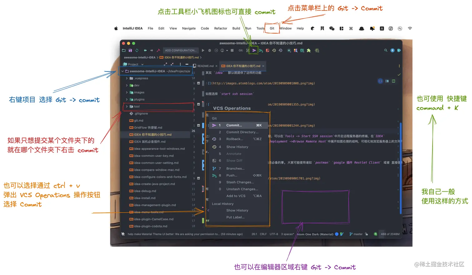 图片上应该标的很清晰了,大家就看图片吧,做好对应的配置和填写好对应的 commit message 之后,就可以点击下方的 commit 了。