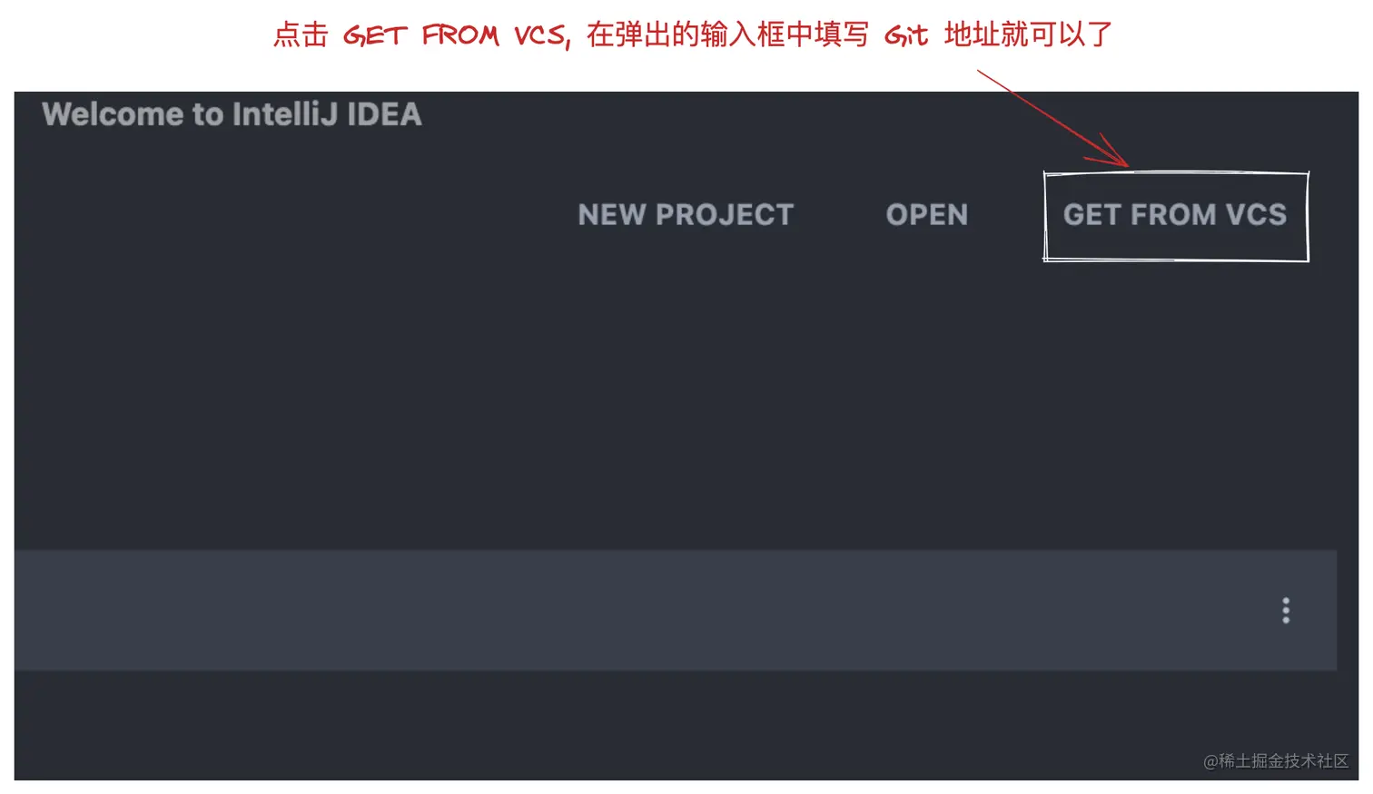 上面演示的是在启动页面,直接点击右上角的 GET FROM VCS,然后填入项目地址即可。