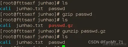 方法三:gzip(压缩)、gunzip(解压) gzip只能对文件进行压缩,不能对文件夹,而且直接在文件上进行操作,后缀名为.gz。linux里红色的代表压缩文件