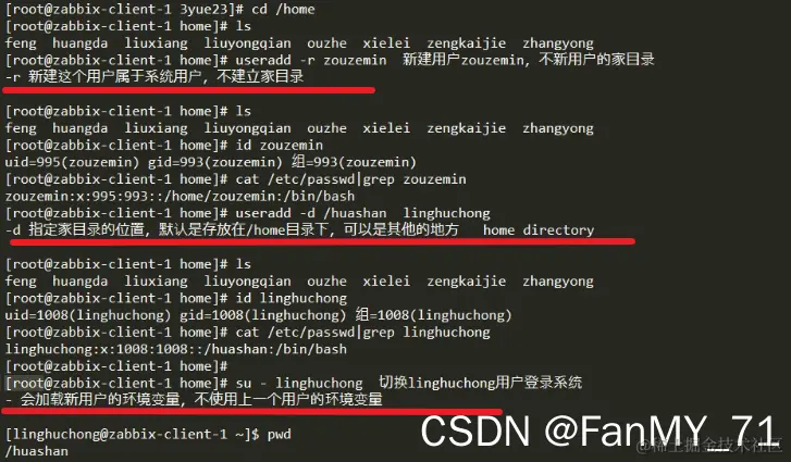 图片关键字:useradd -r + 用户名(新建系统用户)、useradd -d +路径+用户名(指定路径新建用户)、su - +用户名(⭐⭐⭐)