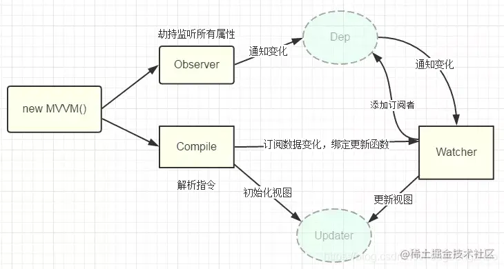 - MVVM作为数据绑定的入口,整合Observer、Compile和Watcher三者,通过Observer来监听自己的model数据变化,通过Compile来解析编译模板指令,最终利用Watcher搭起Observer和Compile之间的通信桥梁,达到数据变化 -> 视图更新;视图交互变化(input) -> 数据model变更的双向绑定效果。
