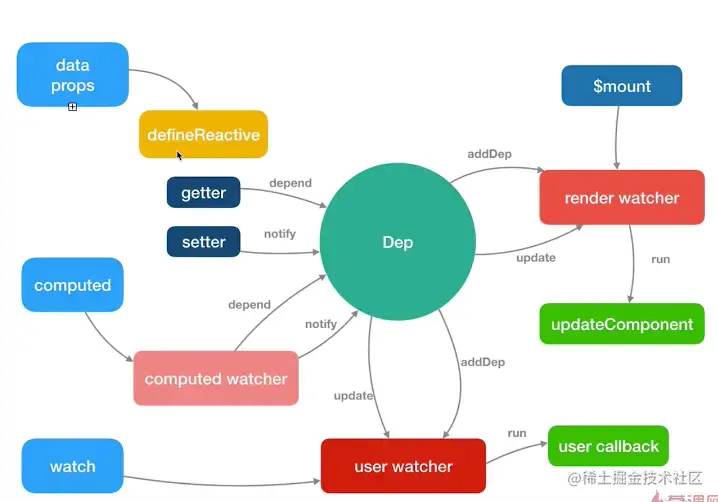 - Watcher订阅者是Observer和Compile之间通信的桥梁,主要做的事情是: ①在自身实例化时往属性订阅器(dep)里面添加自己 ②自身必须有一个update()方法 ③待属性变动dep.notice()通知时,能调用自身的update()方法,并触发Compile中绑定的回调,则功成身退。