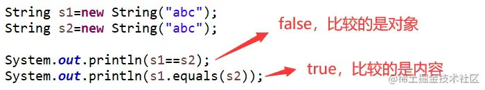- 第一个输出true:两个都是字符串对象,equals比较值