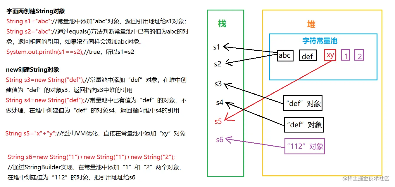 - 注:字面量创建对象的时候,只在常量池创建一个对象;new的时候,常量池有对象,堆中也有对象,字面量方法比new省内存