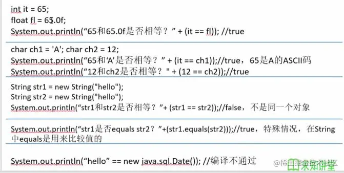- 基本类型比较值:只要两个变量的值相等,即为true。例如:int a=1;if(a==6){……}