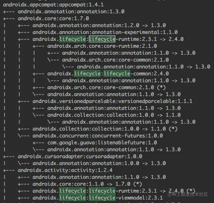 键入:gradlew :app:dependencies 查看依赖树,可以看到core、activity等模块都依赖lifecycle了~