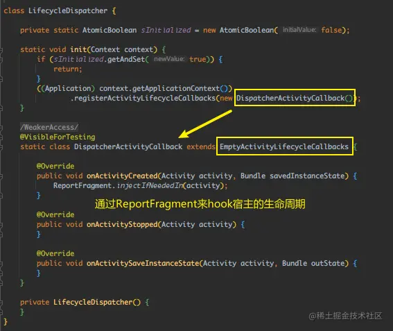 registerActivityLifecycleCallbacks() 是Application提供的一个方法,可以监控App内所有Activity的生命周期。只重写了 onActivityCreated(),通过 ReportFragment 来Hook宿主的生命周期。