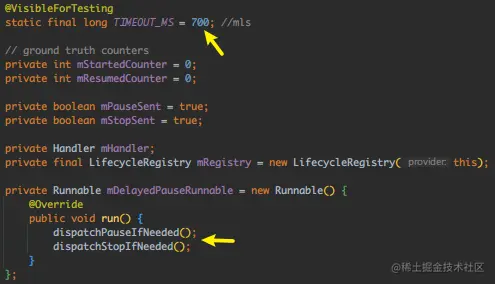 延时700ms,然后去验证是否处于后台,然后 LifecycleRegistry 转发生命周期事件,完。简单点就是封装了 Application.ActivityLifecycleCallbacks,并提供了一个全局的 LifecycleOwner。