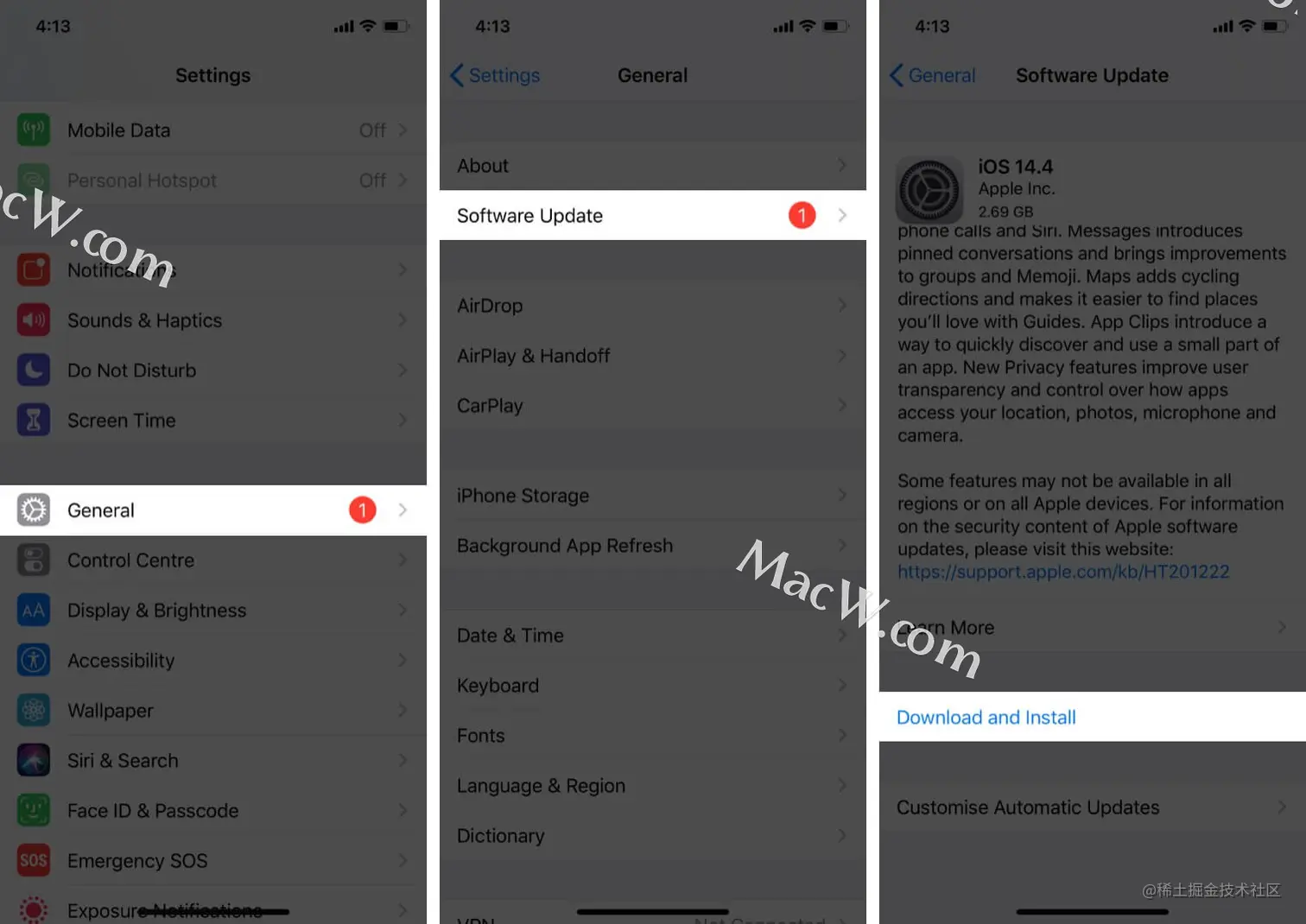 - 对于 iPhone:打开 设置 应用程序 → 点击 常规 → 点击 软件更新→ 下载并安装 ,如果您看到待处理的更新。