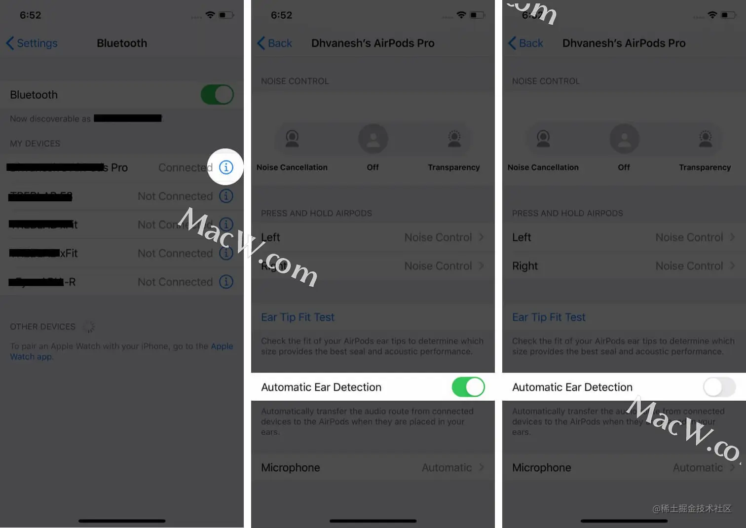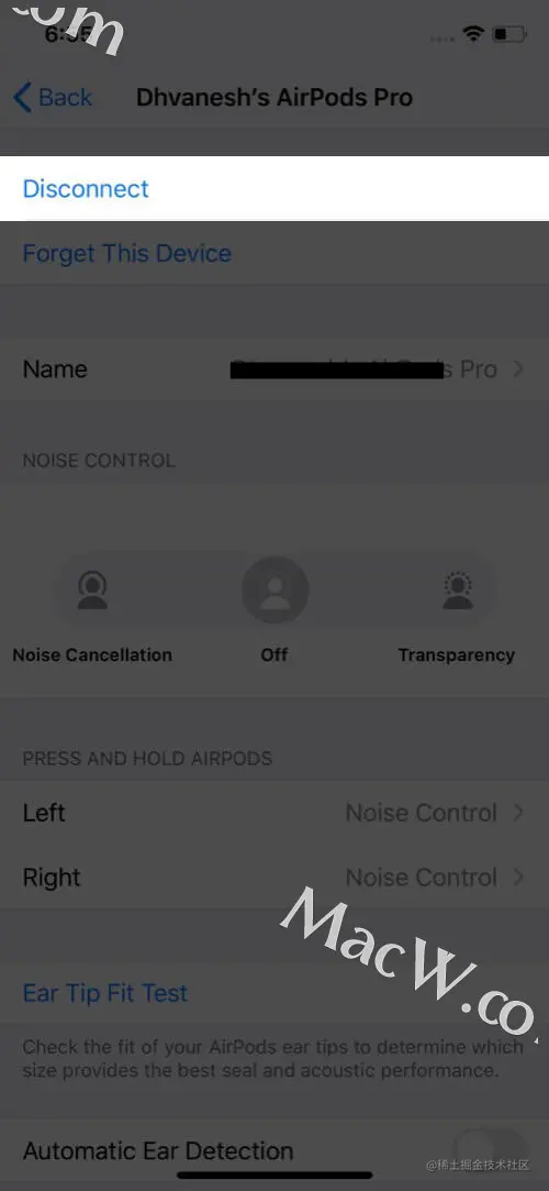 - 点击您的 AirPods Pro 名称旁边的(i) 。现在向下滚动并关闭自动耳朵检测的切换。