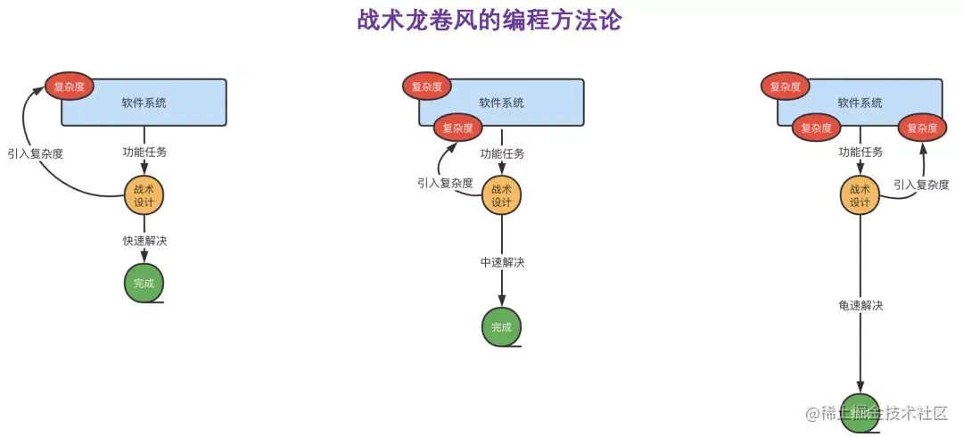 但不可否认,他一定是当前最快的。这就是战术设计的特点之一,永远按当前最快速交付的方案进行推进,甚至很多组织鼓励这种工作方式,为了使功能更快运作,只注重短期收益而忽略长期价值。