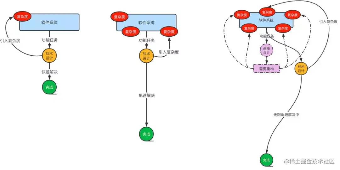 没有系统是天然复杂的,为了快速完成任务不断引入新的复杂度至系统逐渐腐化,无限增长与无限传递的复杂度让软件需求越来越难“快速完成”。当有一天我们意识到系统的复杂性时再试图通过战略设计进行软件的迭代,你会发现举步维艰,一处很小的修改需要投入大量的基建修复,最终我们不得不向成本低头,不断再通过战术设计无限的苟且。