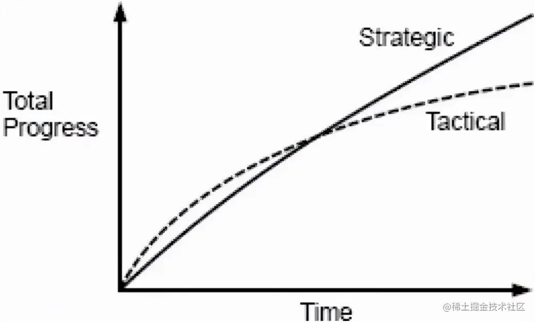 John Ousterhout教授在 A Philosophy of Software Design 书中提到了战略设计与战术设计的总成本投入。随着时间的流逝,战略设计可以有效控制软件成本,但战术设计会随着时间的推移线性递增。这与Martin Fowler在 Patterns of Enterprise Application Architecture 这本书中所提的关于数据驱动与领域驱动关于复杂度的治理是同样的含义,要致力于长期的价值投资。