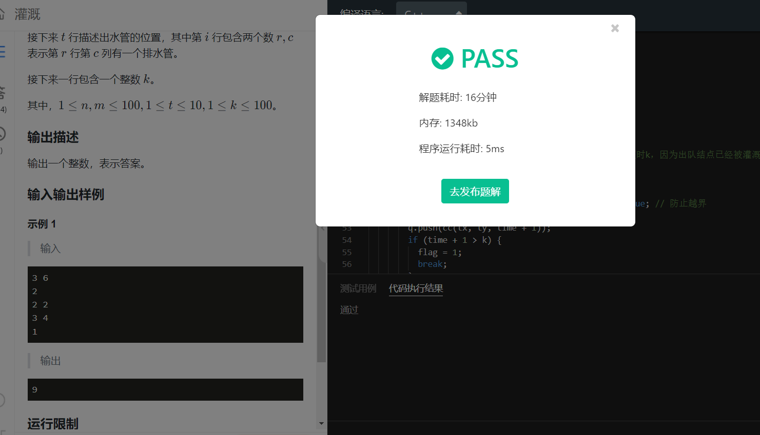 和普通的bfs区别就是加上了一个time属性,通过入队结点的time属性值来判断方格的灌溉时间是否已经超时,如果超时,则提前结束。