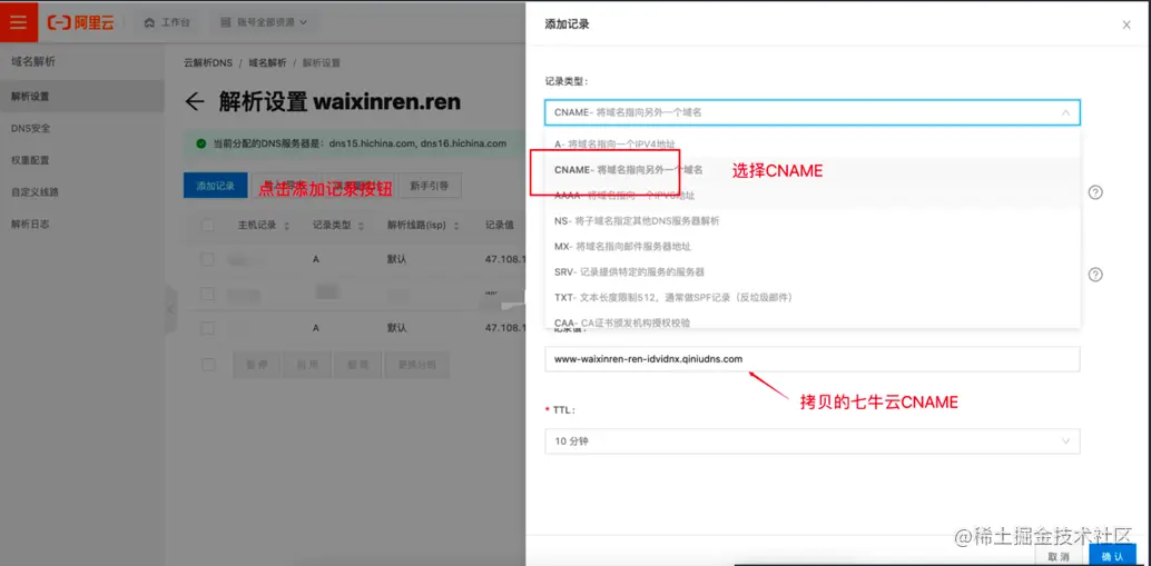 在对应的空间下面绑定好域名后,鼠标放在刚绑定好的域名旁边复制七牛云给你分配的CNAME,最后来到阿里云我们新建一个域名记录绑定CNAME即可。