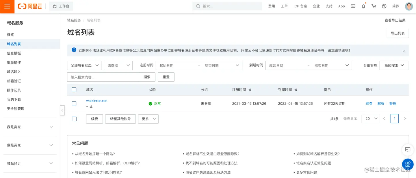 首先不用多说,你得搞到一个合法合规的域名(记住备案备案备案)这里以阿里云域名作为示例演示。还没有域名的小伙伴赶快get一个,我们准备发车了!