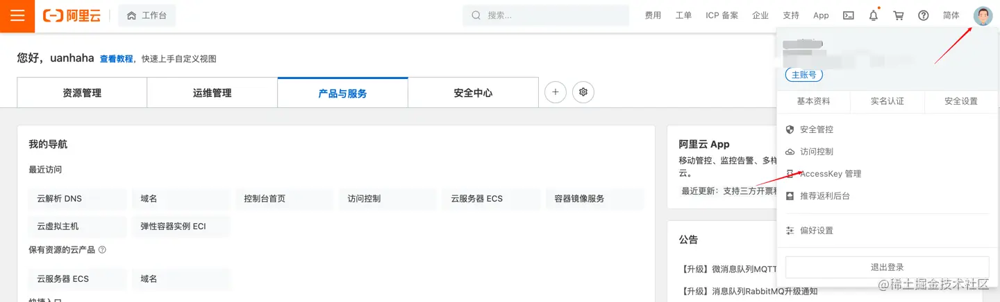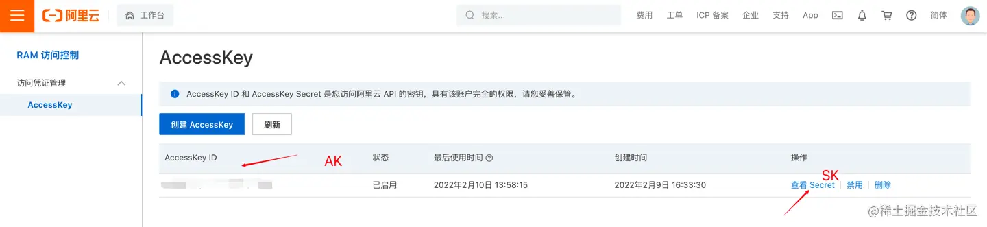 查看阿里云账号的AK和SK后文会需要。