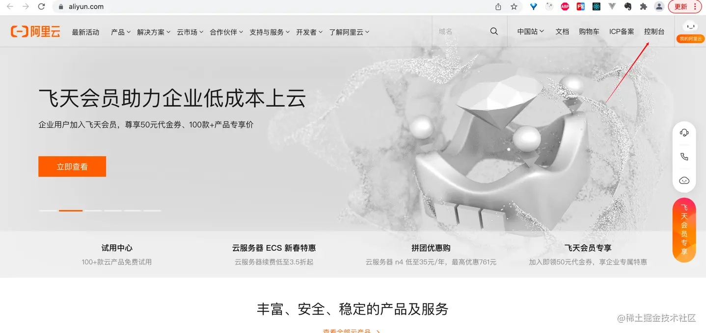 进入阿里云官网点击右上角控制台。