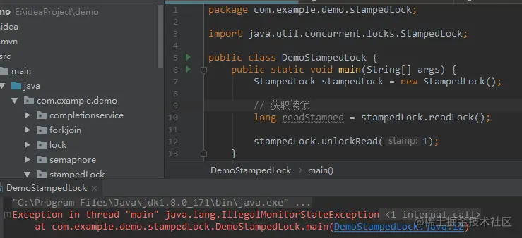 解锁时需要将stamp值传入解锁方法,不然解锁失败抛出异常IllegalMonitorStateException。