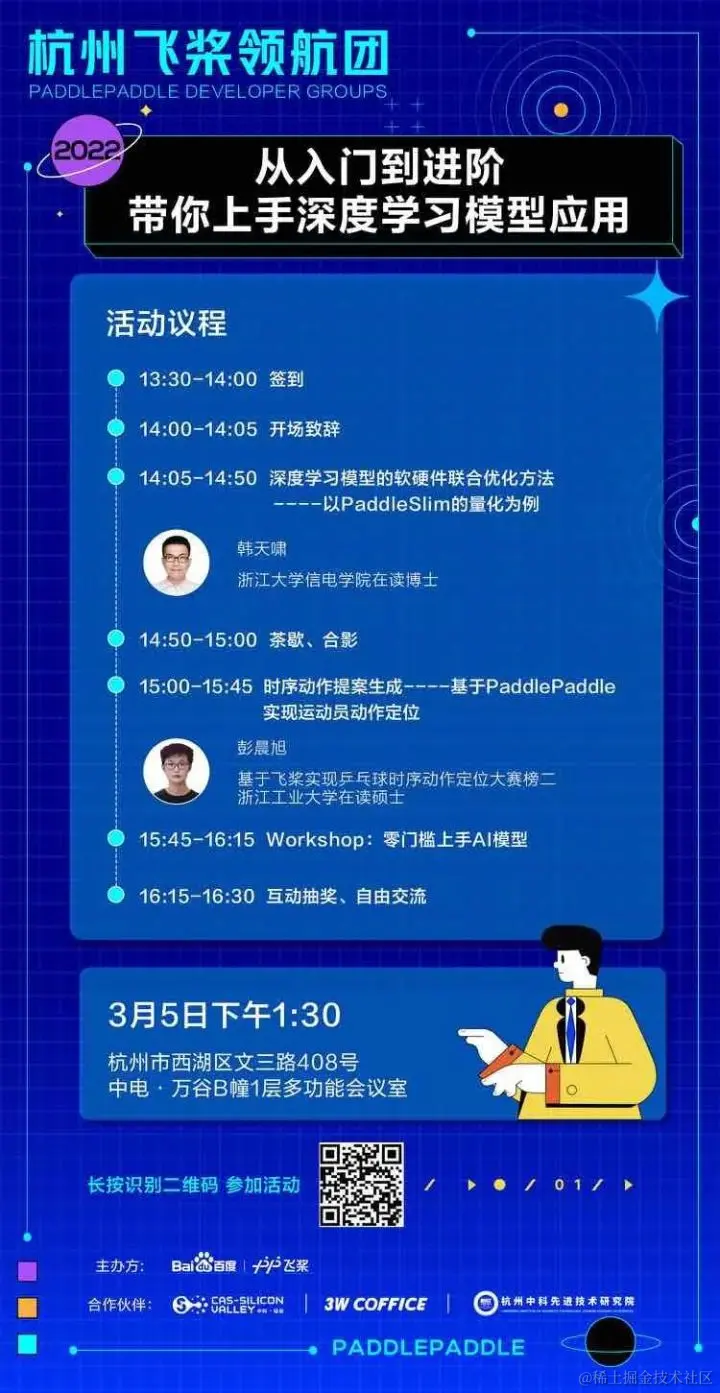 3月5日,杭州飞桨领航团将举办线下开发者Meetup,以深度学习在图像和视频领域的应用为例,探讨算法原理和模型优化的实现。还有教你零门槛上手AI模型的Workshop环节等你来玩。这个初春,来和我们一起在杭州赏赏春色、聊聊AI吧!
