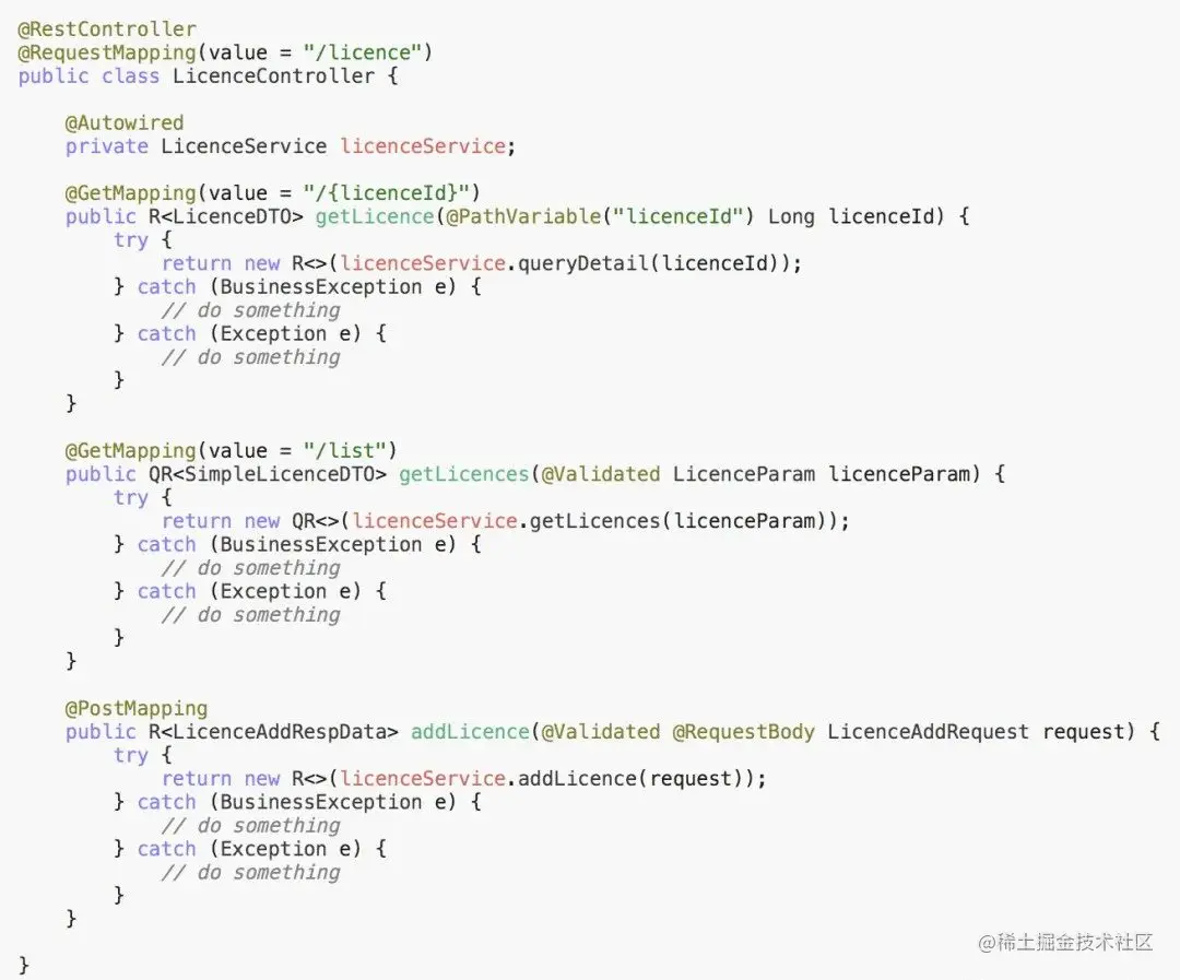 上面的示例,还只是在Controller层,如果是在Service层,可能会有更多的try catch代码块。这将会严重影响代码的可读性、“美观性”。
