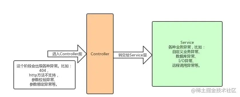 注意到上面对异常按阶段进行分类,大体可以分成:进入Controller前的异常 和 Service 层异常,具体可以参考下图:
