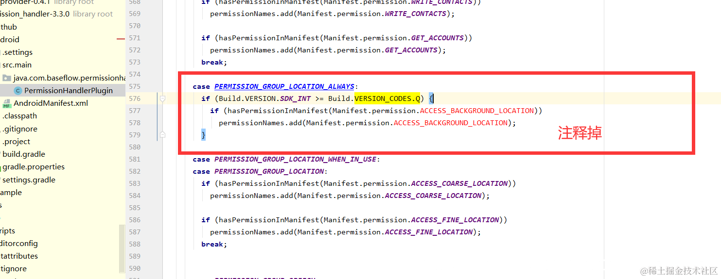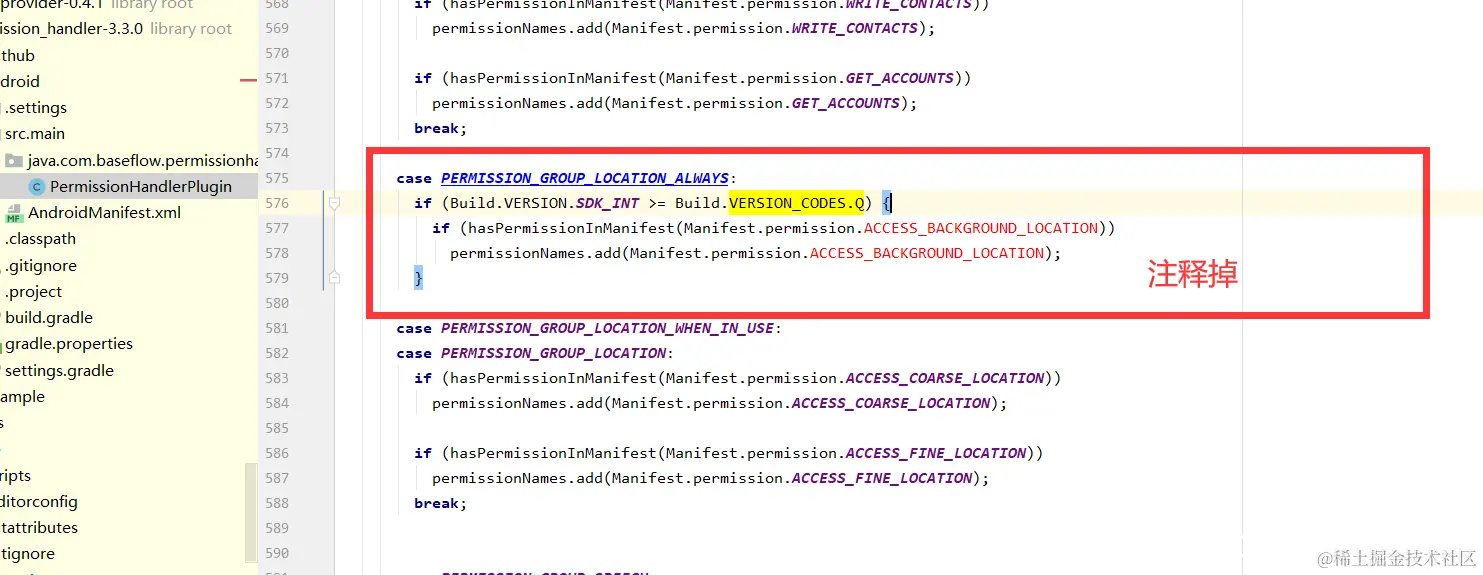 我的做法是将报错的位置直接注释,比如上方576行出现错误,我就将这个代码块直接注释。因为我使用这个依赖的目的是能够动态申请定位权限,所以我注释后能够实现我的目的即可,别的不用管。