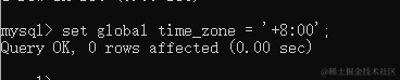 不少文章写到这里就结束了,直接会显示时区变成了东八区,而实际上却不是这个样子的,也可能是mysql版本的区别。我在第四步操作完,只是有如下提示: