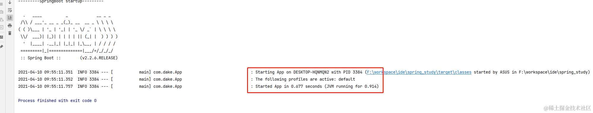 这是第二个自动退出的项目。可以看到,已经没有了关于未设置激活配置文件的提示。同样的,我们也在第一个项目中的application.properties文件中加上这样一句话,再启动后发现也没有了: