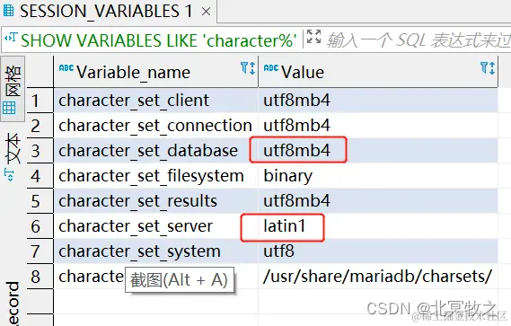 这个原因的产生是编码问题,我们可以查看数据库字符集编码: