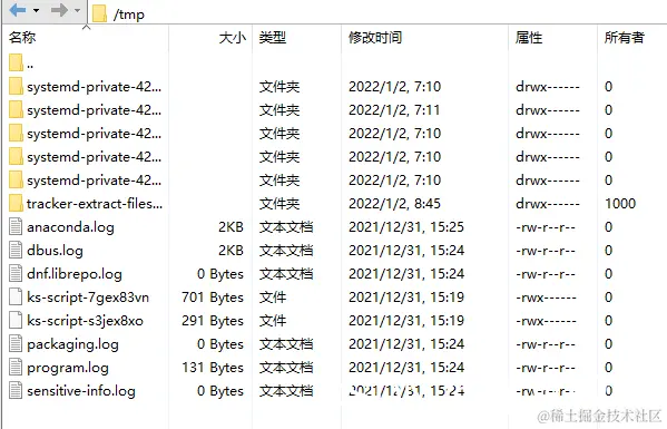 fangdake01是我们刚才创建的用户,登陆之后发现在该用户自己的目录下,什么都没有,因为这个是我们刚创建一个普通用户而已。如果我们使用fangdake来登陆的话,发现就不一样了。我们可以访问对应的目录,比如以临时目录文件来说: