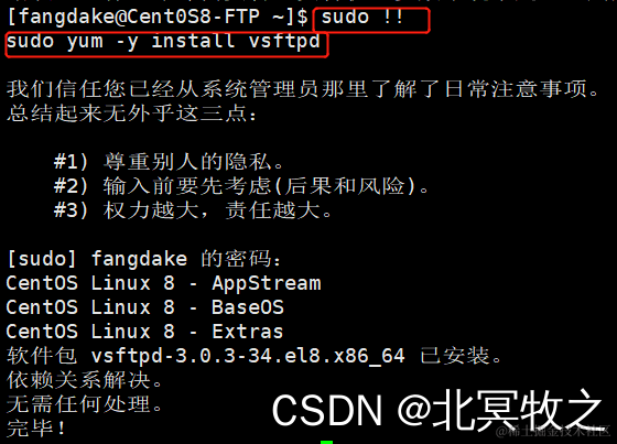 命令!!的意思就是重复上一条执行的命令,所以我的 sudo !! 的下面显示的就是我们真正要执行的命令。输入密码之后自动安装。