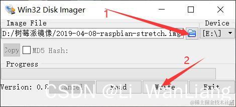 第二步: 打开Win32DiskImager,并将树莓派镜像文件导入到Win32DiskImager中,这里要注意不能选错了磁盘,然后点击Write。