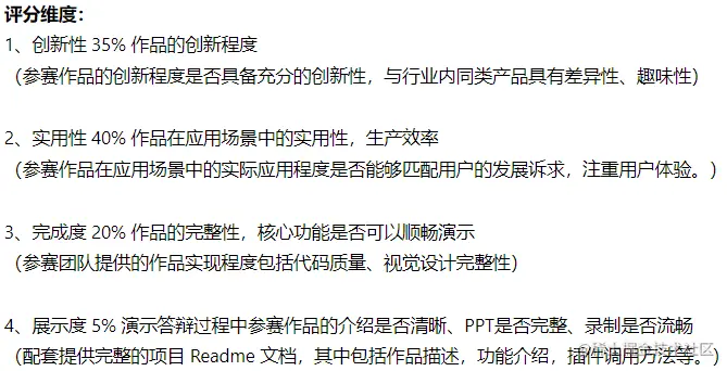 不能违反的规则这一点不用过多强调,大家一起参赛,追求的也是公平竞争。如果有些规则是组委会明确说明不能违反的,那就必须严格遵守。至于评分规则,可以说是合理利用规则来「投其所好」。在时间和精力有限的情况下,是否了解评分规则,会直接影响到整个团队在整个过程中的时间和精力分配。一般评分规则会包括与主题的匹配度、完成度、产品展示、商业价值、应用前景,创新价值等方面,这就要求参赛者清楚地知道该在哪些环节进行重点投入。还是拿FinClip Hackathon举例子来说,「应用前景」占到了很高的比重,跟「创新性」相当。所有考虑到一定是团队资源和时间宽裕的前提下,我们应该选择在应用前景或者创新价值投入了更多的精力。这样符合比赛的评分机制,才能更好的从众多的作品中脱颖而出。