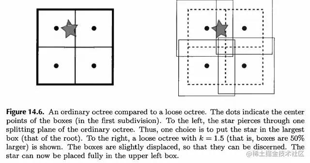 第2种方法比较常用,但是如果物体的包围盒与场景中心相交,那么即使再小的节点,也会被放到根节点中。而要解决这个问题,可以用松散四叉树。当划分空间时,将这个空间适当扩大,以容纳更多的物体,这样很多物体会被尽可能的子节点容纳,从而提高索引效率。