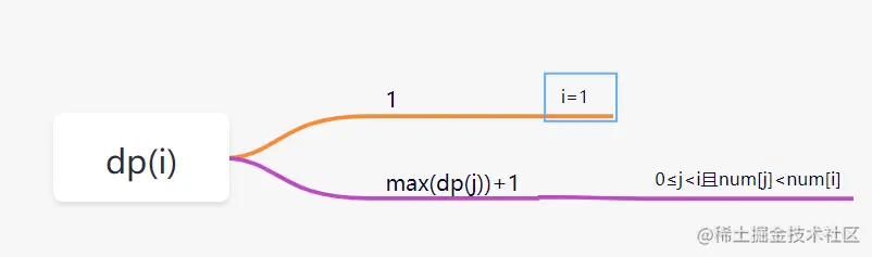 - 如果存在j属于区间[0,i-1],并且num[i]>num[j]的话,则有: dp(i) =max(dp(j))+1。