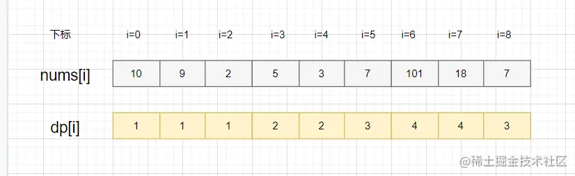 - nums[5]=7,以7结尾的最长子序列就是[2,5,7]和[2,3,7],因为从数组下标0到5遍历,找到2,5和3都比7小,所以就有[2,7],[5,7],[3,7],[2,5,7]和[2,3,7]这些子序列,最长子序列就是[2,5,7]和[2,3,7],它俩不就是以5结尾和3结尾的最长递增子序列+[7]来的嘛!所以,dp[5]=3 =dp[3]+1=dp[4]+1。