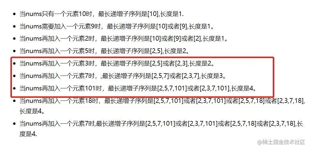 - 当nums再加入一个元素7时,最长递增子序列是[2,5,7,101]或者[2,3,7,101]或者[2,5,7,18]或者[2,3,7,18],长度是4.