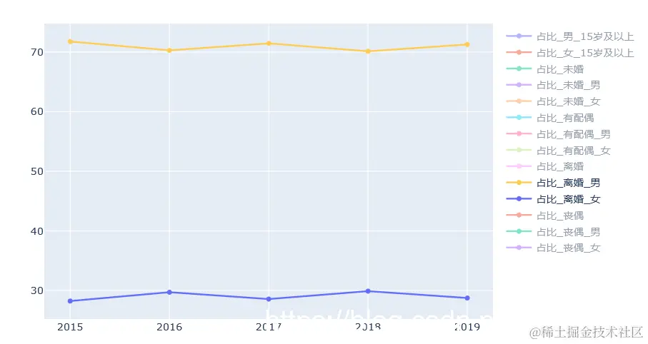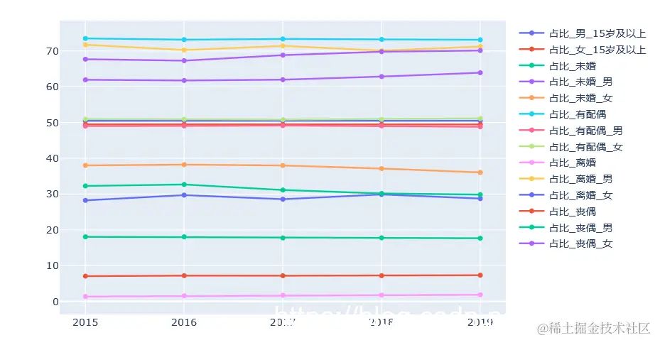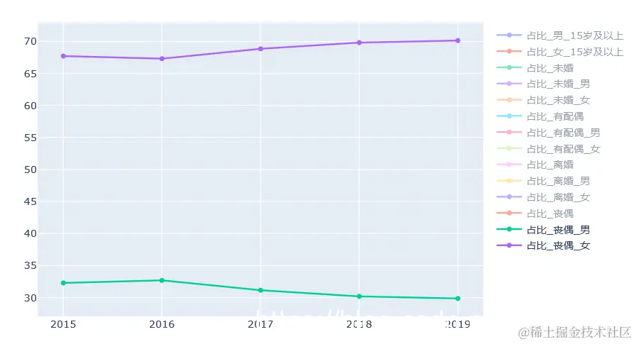 15岁丧偶情况,整体小幅度上升趋势。估计是老龄化导致,比较年轻人占比逐步减小。而比较有意思的是,男女的上丧偶占比三七分,应该是女生丧偶后更多选择坚守曾经那份爱情吧,或是男人们工作压力大,而且从事危险工作多。程序员等996人群不容易,且包容您的丈夫吧,他为了这个家也不容易。爱情,婚姻,始终都是两个人的。