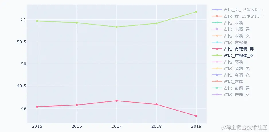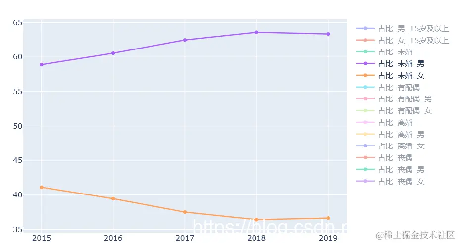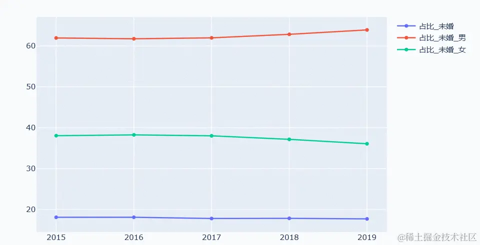发现,2015年-2019年未婚人数占比率逐年下降,由18%降到17.6%。女生未婚人数由38%降到36%,看样子大家都结婚啦 ,而且估计步入15岁的年轻人人口逐步减少,所以未婚率下降,比较符合我国国情。再看看男生未婚的,却是由61%上升到63%。 未婚人群中,63%都是男的打光棍,女生占比不到40%。
