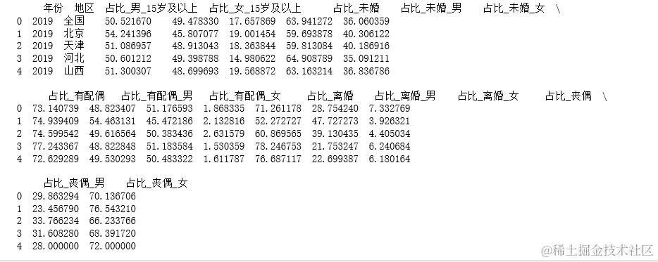 df01['占比_未婚'],df01['占比_未婚_男'] ,df01['占比_未婚_女']= [df01['未婚'] / df01['15岁及以上'],df01['男_未婚'] / df01['未婚'],df01['女_未婚'] / df01['未婚']]