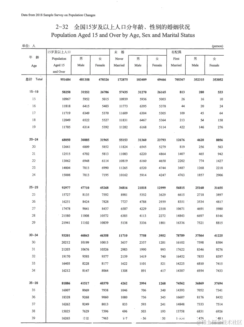 按年龄层性别分布婚姻状况,数据为《中国人口和就业统计年鉴 _第二部分年人口变动情况省略及以上人口分年龄_性别的婚姻状况》,及根据年龄层分布的婚姻状况数据,数据均是取全国1%人口抽样调查数据样本。本次分析取2018-2019年数据,2017年的数据没找到,所以只分析两年数据。部分数据样本如下: