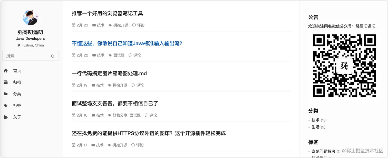 强哥在自己的电脑虚拟机上部署了自己的博客网站,同时对带宽进行了限制,并用花生壳将服务暴露到公网。这里再欣赏一下强哥的博客网站: