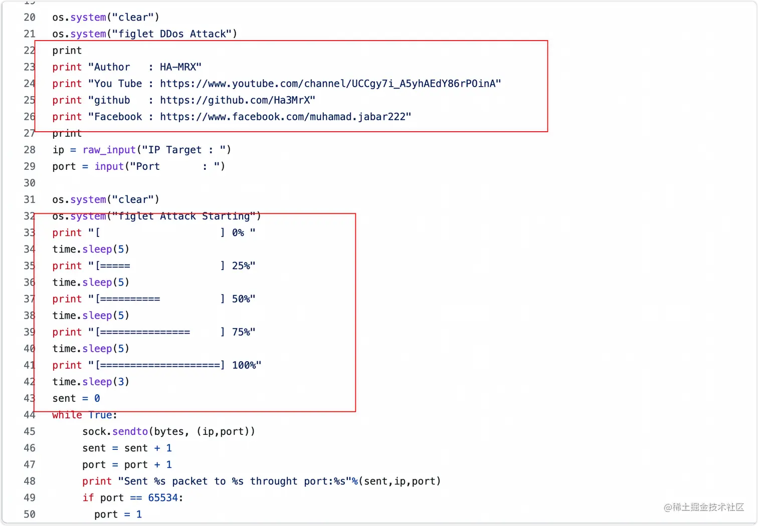 还美其名曰:“攻击目标主机的所有端口,造成目标瘫痪”。额,大哥,一个网站正常就开放80或443端口,你搞这么多端口去遍历别人干什么,不是浪费自己带宽吗?外加,你这个就是死循环发TCP请求,充其量也就是个DoS请求,人家做个爬虫还用IP代理池呢,你是完全自己往上怼,和别人硬刚啊。