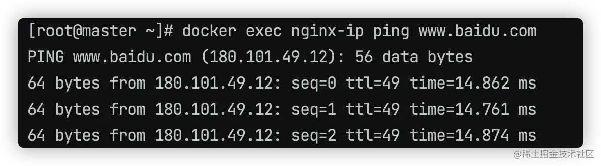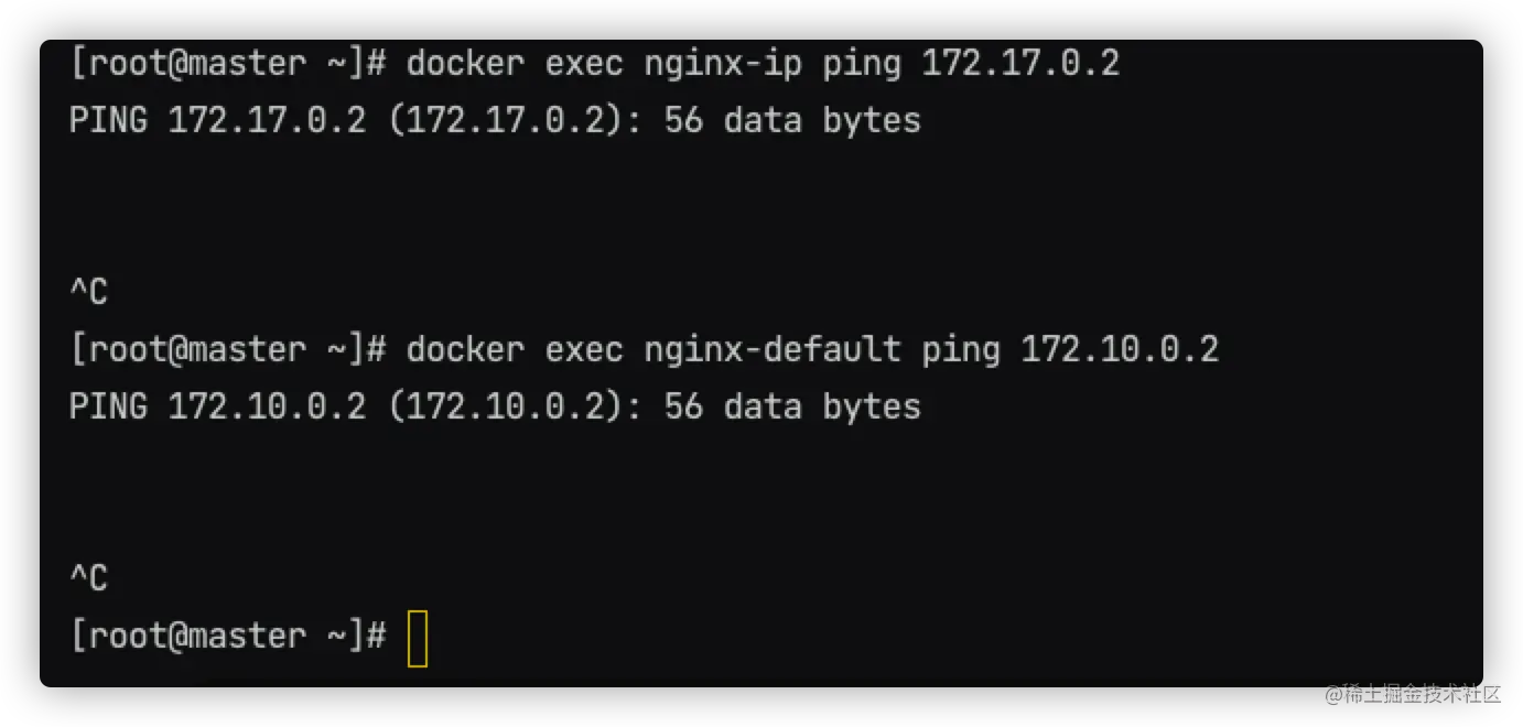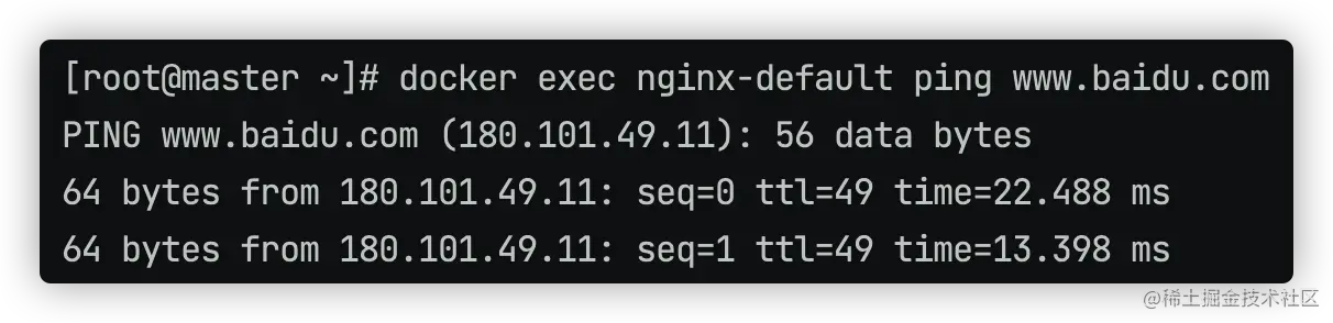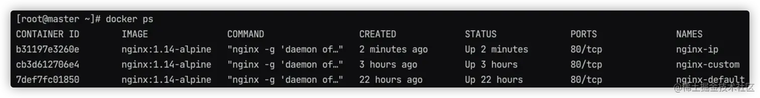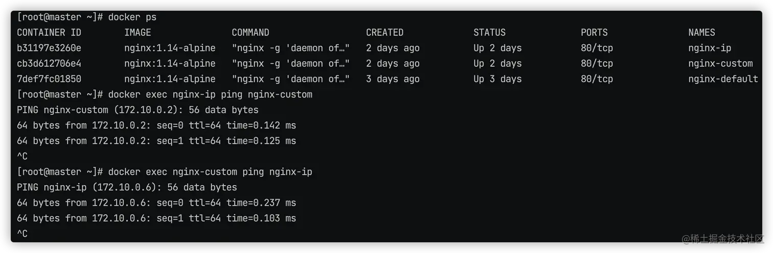 结果是对的,那 nginx-default 是否能和其他两个容器相通呢?验证一下就知道了!