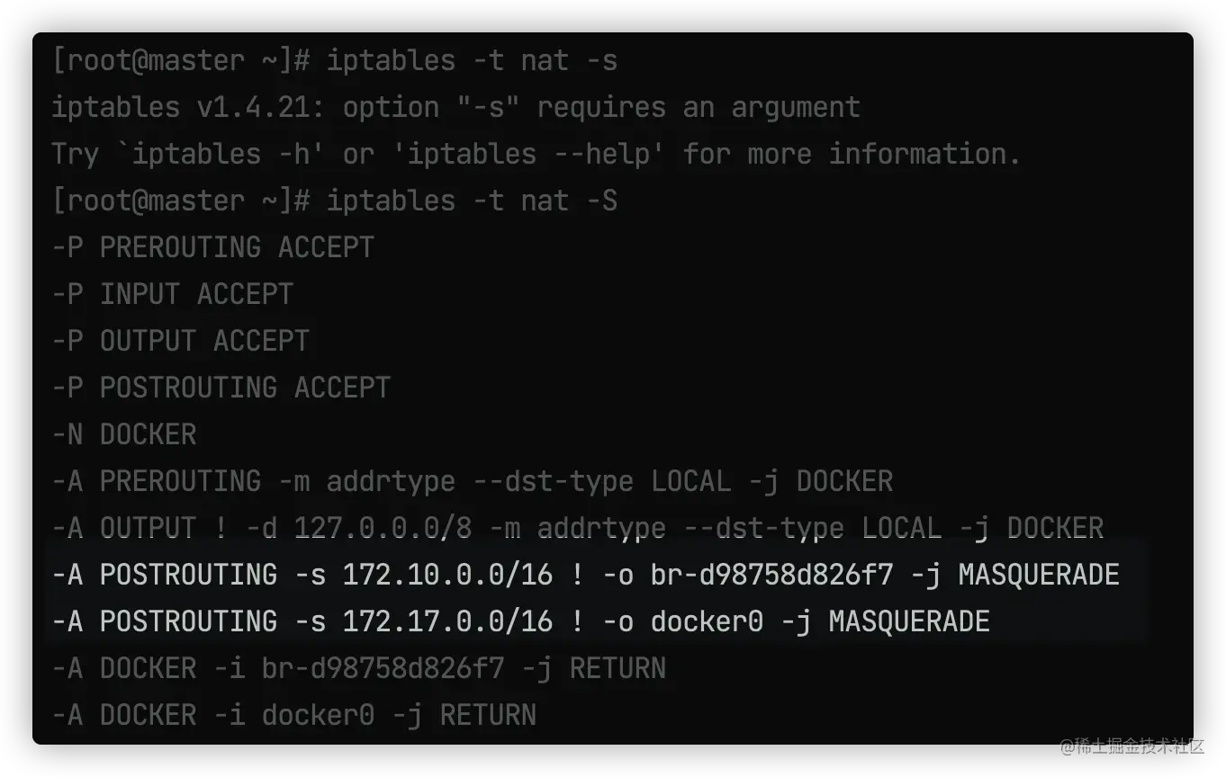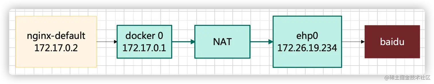 可以看到有这么两条规则,一条是 docker 0,一条是小菜农刚刚自定义的,那它是什么意思呢?小菜农又犯迷糊了,看了旁边的肖老大,这不有现成的大佬可以问吗!肖老大有些好奇,小菜农这是接到啥需求了,怎么会问到这个问题,不过也没多想,新人总要照顾好的不是!便开始巴拉巴拉解释起来,小菜农也听得云里雾里,“这样说明白了吗?”。“啊?哦!差不多知道这个意思了,嘿嘿,谢谢肖老大”,“不客气不客气,下次遇到不会记得还来找我哈”,肖老大略微粗犷的嗓门,让小菜农倍感温馨!总结了下肖老大的解释:如果网桥 docker 0 接收到来自 172.17.0.0/16 网段的外出包,就会把它交给 MASQUERADE 处理,而 MASQUERADE 的处理方式就是将包的源地址替换成 host 的地址发送出去,即做了一次网络地址转换 NAT。