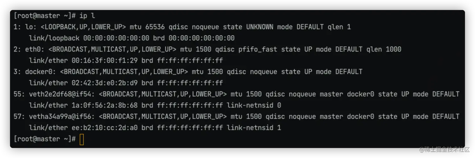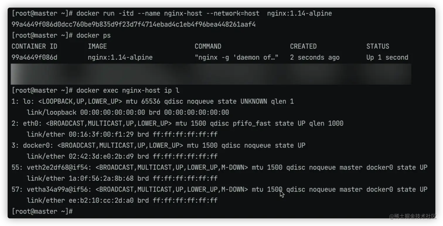 原来他在上面的时候曾经输入 ip l 查看了宿主机的网络,你可以发现这两个配置是一模一样的!那就说明连接到 host 网络的容器共享 Docker host 的网络栈,容器的网络配置与宿主机的配置完全一样。那这样子的话直接使用 Docker host 网络的最大好处就是性能了。如果容器对网络传输效率有较高要求的时候,就可以使用 host 网络,也相当于是使用宿主机的网络,那么这样做的缺陷是什么?那就是端口会冲突,在宿主机上已经使用的网络,容器就不能再使用了!