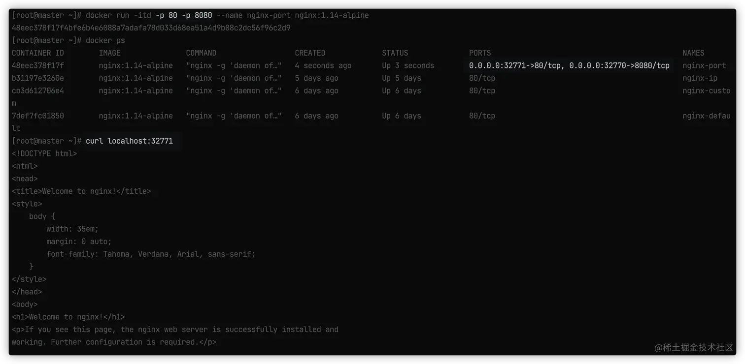 启动容器后,便可以利用 32771 这个端口号进行访问,而32771这个端口是宿主机自动分配的,小菜农又试了下自己指定端口访问