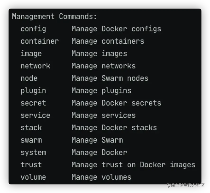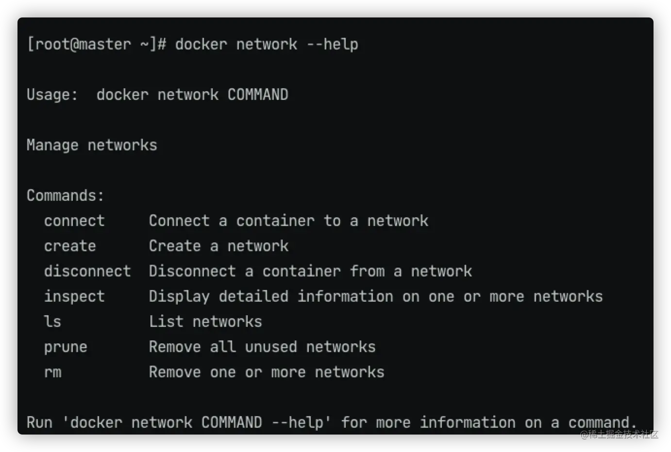 docker 容器在安装的时候会自动在 host 上创建三个网络,小菜农看到了这句话,那要怎么查看这三个网络了,通过help指令看看会不会有所发现?他快速地在终端敲入docker --help
