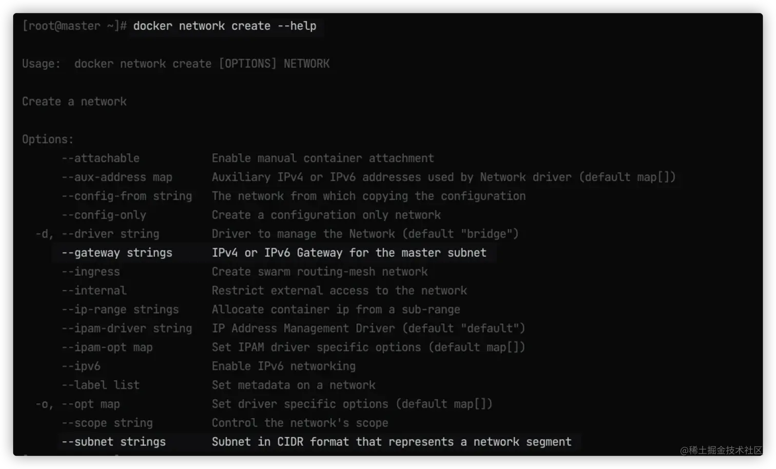 “但是如果自定义的网络多了起来,分配的网段肯定也是随之增加,那由 docker 分配的网段肯定是随机,不方便记忆,能不能自己指定 IP 网段”,小菜农突发奇想,输入 docker network create --help 会不会有所发现?